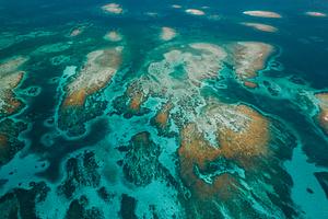 Drone photo of coral patches near Silk Cayes in Southern Belize.